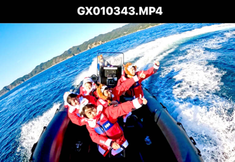 激しい揺れとスピードでスマホが持てないRIBライドの魅力を活かし、固定カメラで撮影した動画をその場でプレゼントします 。