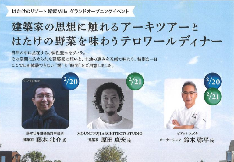 はたけのリゾート燦燦Villaでは2026年2月20日(金)~21日(土)にグランドオープンを記念し特別イベント「建築家の思想に触れるアーキツアーとはたけの野菜を味わうテロワールディナー」を開催いたします。この2日間には、建築を担当した藤本壮介氏本人が登壇し、はたけのリゾート燦燦Villaで生まれた「渦の家/UZU」「楼の家/ROU」、そして大阪・関西万博を象徴する大屋根リングの建築秘話や未来へと連なる建築思想を、本人の言葉で体感できる希少な時間をご用意しています。