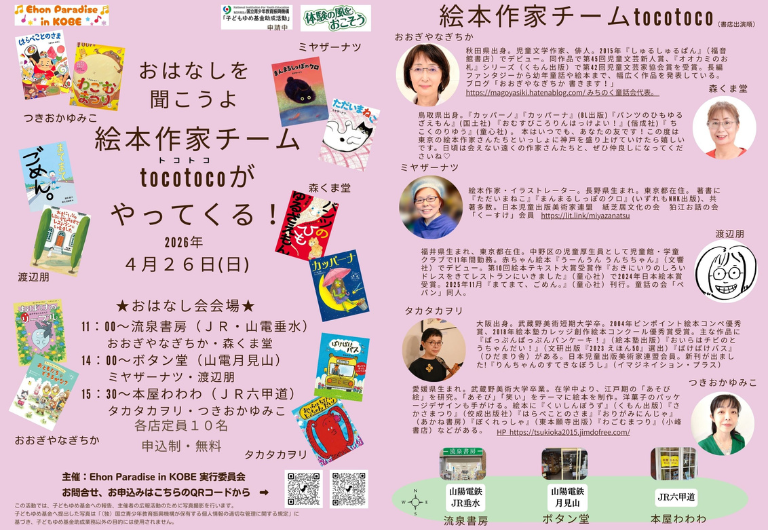 東京からやってきた絵本作家チームtocotocoの5人組と神戸ゆかりの森くま堂さんが神戸の書店を回り、おはなし会を開催します。